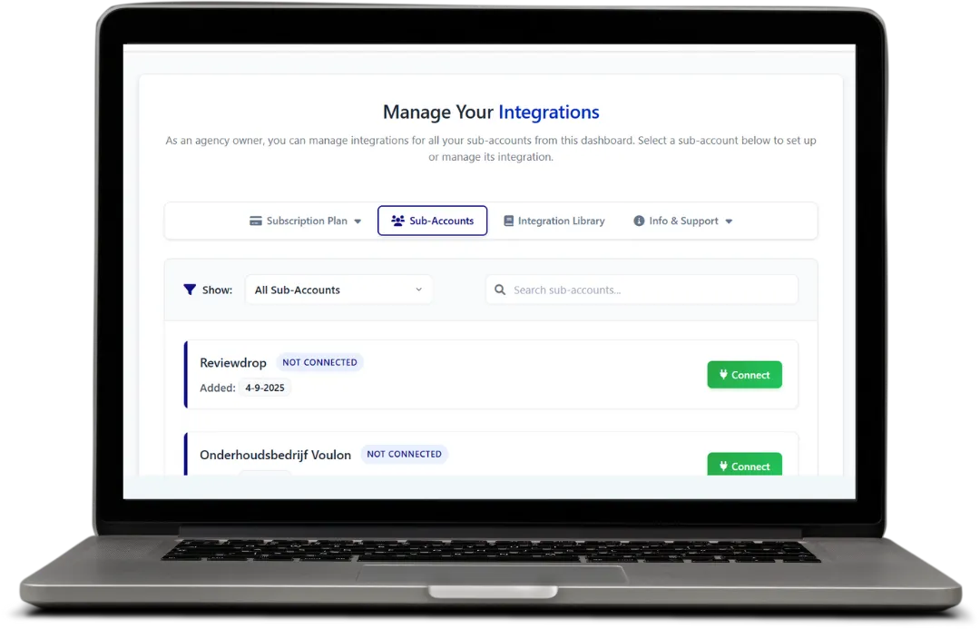 Connecting a client's system to GHL is effortless. Enter the Location ID and subaccount API key, let the business owner log in to their CRM, and you're all set!